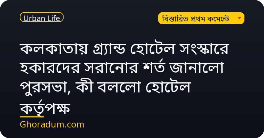কলকাতায় গ্র্যান্ড হোটেল সংস্কারের সময় হকারদের সরানোর শর্ত দিয়েছে পুরসভা। হোটেল কর্তৃপক্ষের প্রতিক্রিয়া ও পরিকল্পনা নিয়ে বিস্তারিত।