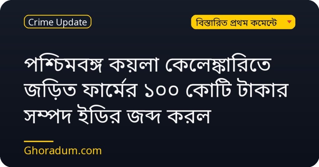 পশ্চিমবঙ্গের কয়লা কেলেঙ্কারিতে জড়িত একটি ফার্মের ১০০ কোটি টাকার সম্পদ ইডি জব্দ করেছে। এই পদক্ষেপ আইনি প্রক্রিয়ার অংশ হিসেবে নেওয়া হয়েছে।