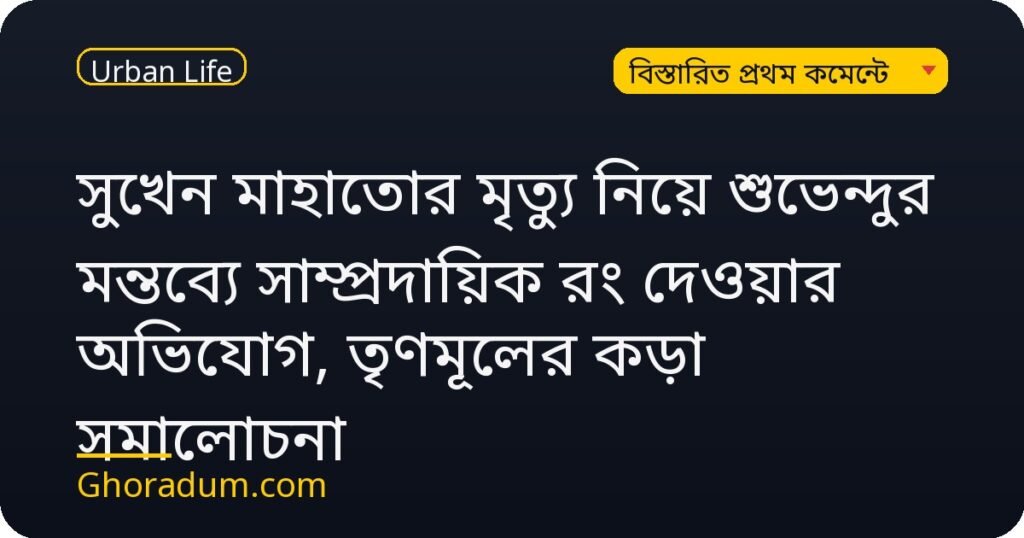 সুখেন মাহাতোর মৃত্যু নিয়ে শুভেন্দু অধিকারীর মন্তব্যে সাম্প্রদায়িক রং দেওয়ার অভিযোগ উঠেছে, তৃণমূল কড়া সমালোচনা করেছে। কলকাতা ও পশ্চিমবঙ্গের রাজনৈতিক প্রেক্ষাপটে ঘটনা।