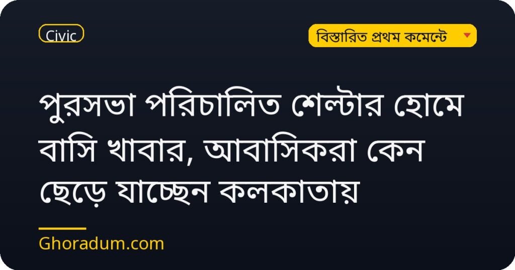 কলকাতার পুরসভা পরিচালিত শেল্টার হোমে বাসি খাবারের কারণে আবাসিকরা ছেড়ে যাচ্ছেন। এই পরিস্থিতি জনসাধারণের কল্যাণে প্রভাব ফেলছে।