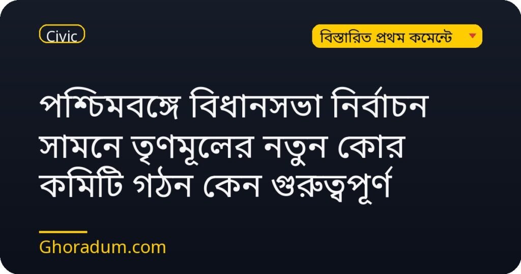 পশ্চিমবঙ্গে আসন্ন বিধানসভা নির্বাচনের জন্য তৃণমূল কংগ্রেস নতুন কোর কমিটি গঠন করেছে, যা নির্বাচনী প্রস্তুতিতে গুরুত্বপূর্ণ ভূমিকা রাখবে।