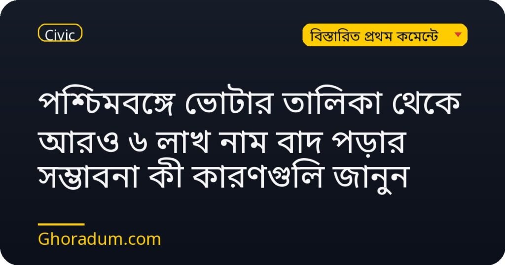 পশ্চিমবঙ্গে ভোটার তালিকা থেকে ৬ লাখের বেশি নাম বাদ পড়ার সম্ভাবনা নিয়ে কারণগুলি বিশ্লেষণ করা হয়েছে। কলকাতা ও পশ্চিমবঙ্গের ভোটারদের জন্য গুরুত্বপূর্ণ তথ্য।