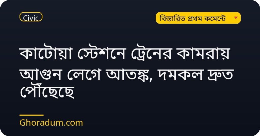 বর্ধমানের কাটোয়া স্টেশনে একটি ট্রেনের কামরায় আগুন লেগে আতঙ্ক সৃষ্টি হয়। দমকল দ্রুত ঘটনাস্থলে পৌঁছে পরিস্থিতি নিয়ন্ত্রণে আনে।