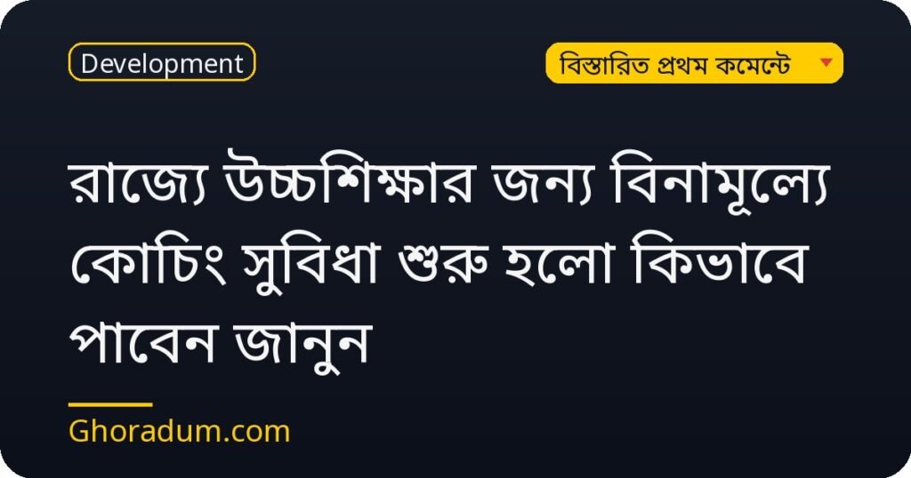 পশ্চিমবঙ্গে উচ্চশিক্ষার জন্য নতুন বিনামূল্যে কোচিং সুবিধা চালু হয়েছে। রাজ্যের ছাত্রছাত্রীদের জন্য এটি একটি গুরুত্বপূর্ণ শিক্ষা উদ্যোগ। কিভাবে সুবিধা পাবেন জানুন।