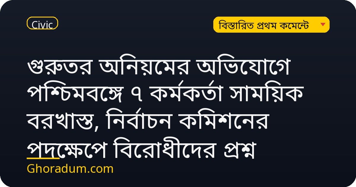 গুরুতর অনিয়মের অভিযোগে পশ্চিমবঙ্গে ৭ কর্মকর্তা সাময়িক বরখাস্ত, নির্বাচন কমিশনের পদক্ষেপে বিরোধীদের প্রশ্ন
