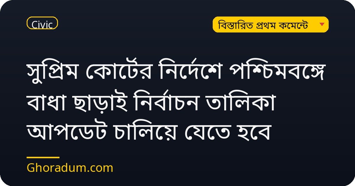সুপ্রিম কোর্টের সাম্প্রতিক নির্দেশনায় বলা হয়েছে, পশ্চিমবঙ্গের নির্বাচন কমিশন বাধা ছাড়াই ভোটার তালিকা হালনাগাদ করতে পারবে। এই নির্দেশনা নির্বাচন প্রক্রিয়ার স্বচ্ছতা ও নিরপেক্ষতা বজায় রাখতে গুরুত্বপূর্ণ ভূমিকা রাখবে। ভোটারদের নাম অন্তর্ভুক্তি ও সংশোধনের ক্ষেত্রে আর কোনো রাজনৈতিক বা প্রশাসনিক বাধা গ্রহণযোগ্য নয়।