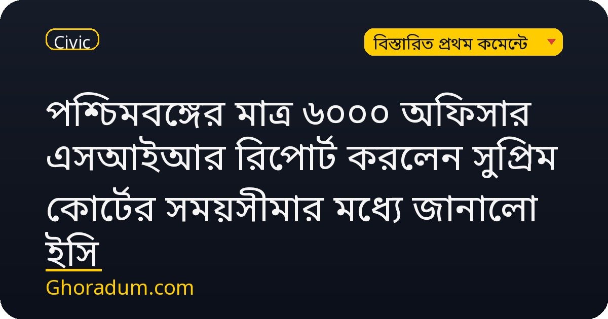 পশ্চিমবঙ্গের মাত্র ৬০০০ অফিসার এসআইআর রিপোর্ট করলেন সুপ্রিম কোর্টের সময়সীমার মধ্যে জানালো ইসি